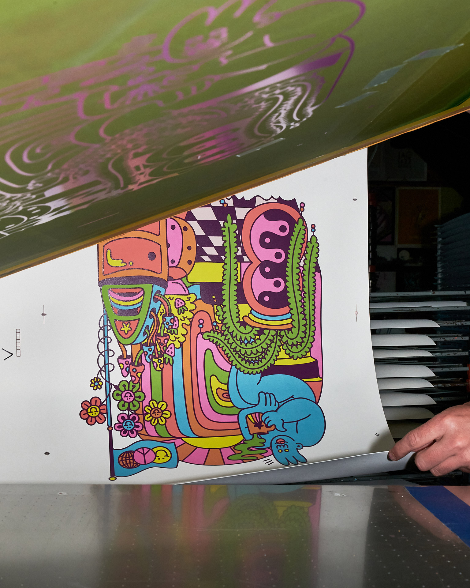 We are so excited to collaborate with Ashley Dreyfus on her new print, Utopia. We have long been admirers of Ashley’s playful and colorful work. As a bonus it is a perfect fit for screenprinting! Using a mixture of transparent and opaque inks we were able to print this with 6 screens on Legion Coventry Rag 250GSM. This edition of 50 is currently available on our site and is signed and numbered by the artist.